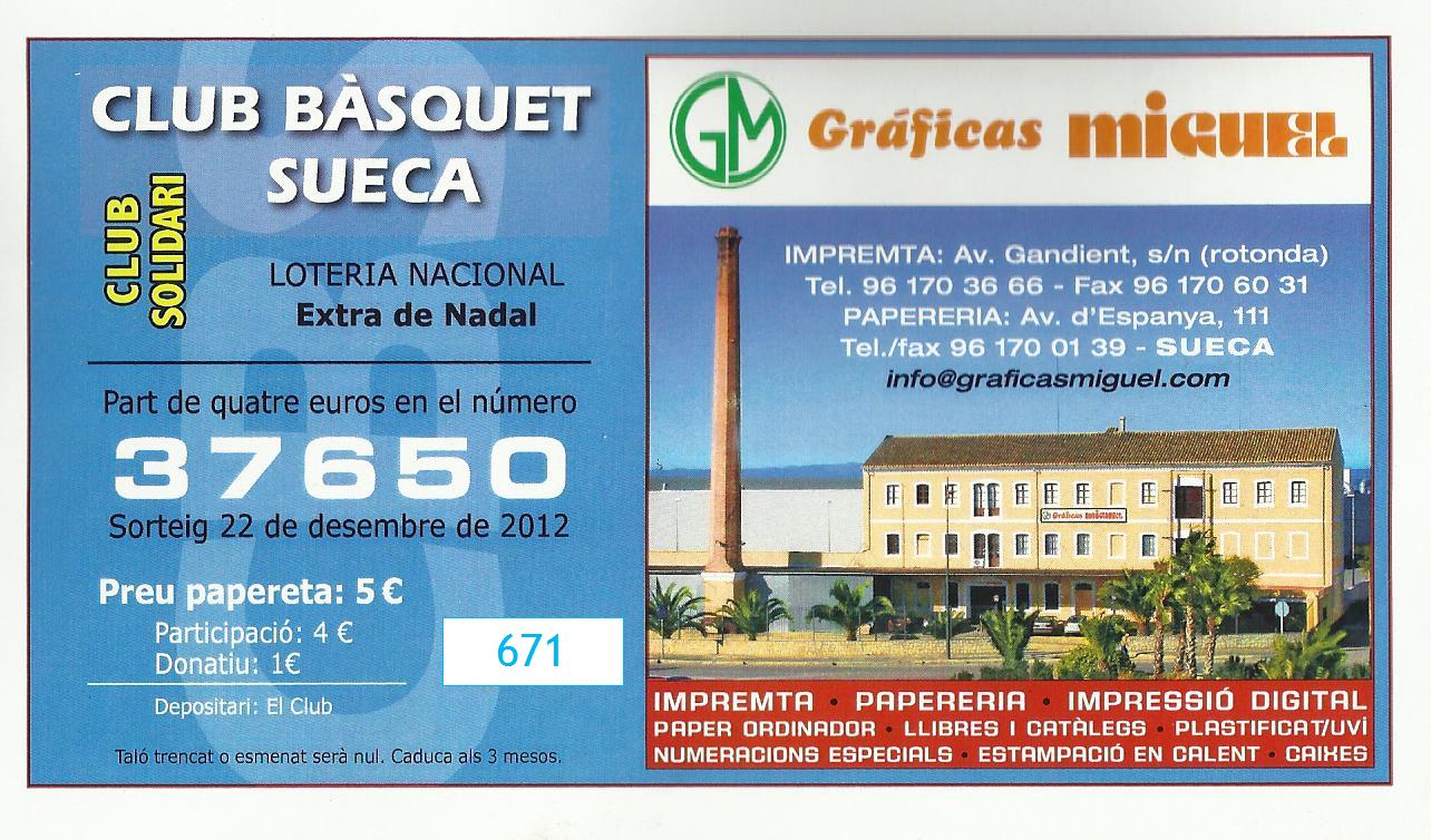 El Club Bàsquet Sueca anuncia que s'ha extraviat un bloc amb 10 paperetes del número 37.650 per al sorteig del 22 de desembre de 2012, en concret les participacions que van desde el 671 al 680.