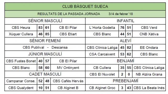 Resultats de la Jornada 3 i 4 de Febrer 2018