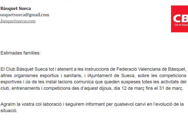 El Club Bàsquet Sueca tot i atenent a les instruccions de Federació Valenciana de Bàsquet, altres organismes esportius i sanitaris, i lAjuntament de Sueca, sobre les competicions esportives i ús de les instal·lacions comunica que queden suspeses totes les activitats del club, entrenaments i competicions des d’aquest dijous, dia 12 de març fins el 31 de març.